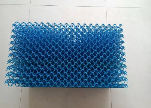 In cooling tower operation, the mesh packing system allows circulating water to be evenly sprayed from the nozzles onto the packing layer below via the distribution pipes. The three-dimensional perforated ribs effectively disperse the water droplets, breaking large water droplets into smaller ones, resulting in a more uniform distribution of circulating water across the next layer of packing. This process ensures three-dimensional water flow, excellent mass transfer, high air utilization, and prevents wastewater blockage and clumping. The PP material is high-temperature and corrosion-resistant, avoiding the gaps and uneven water distribution that can occur at the interface between nozzles when water volume is insufficient, as is common with conventional membrane packing. This allows for full utilization of the membrane packing's heat exchange area, enhancing heat exchange performance. Simultaneously, the mesh packing's low ventilation resistance further increases airflow, improves heat exchange efficiency, and optimizes the overall thermal performance of the tower.