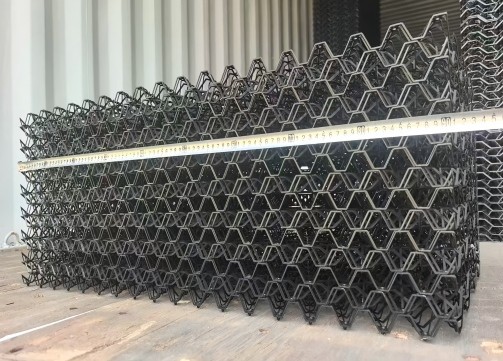 3.To ensure efficiency, two workers are required when assembling the mesh packing. First, place one sheet of packing material on a hardened, flat surface as the assembly base, ensuring the interlocking joints are facing upwards, as shown in the right diagram.